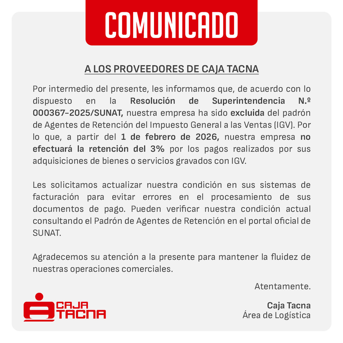 - Comunicado a Proveedores Resolución de Superintendencia N.º 000367-2025/SUNAT – Caja Tacna es excluida del padrón de Agentes de Retención del Impuesto General a las Ventas (IGV) (09 de febrero de 2026)